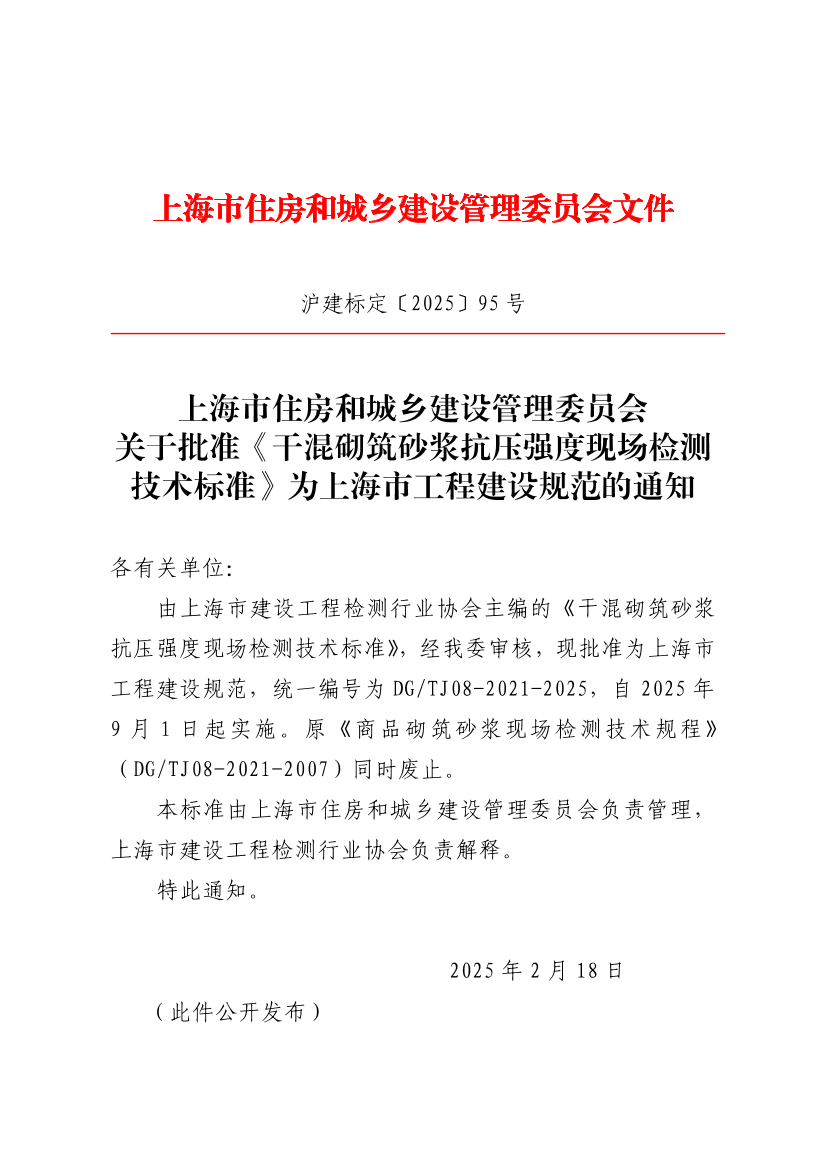 由上海市建设工程检测行业协会主编的《干混砌筑砂浆抗压强度现场检测技术标准》,经我委审核,现批准为上海市工程建设规范,统一编号为DG/TJ08-2021-2025,自2025年9月1日起实施。原《商品砌筑砂浆现场检测技术规程》(DG/TJ08-2021-2007)同时废止。