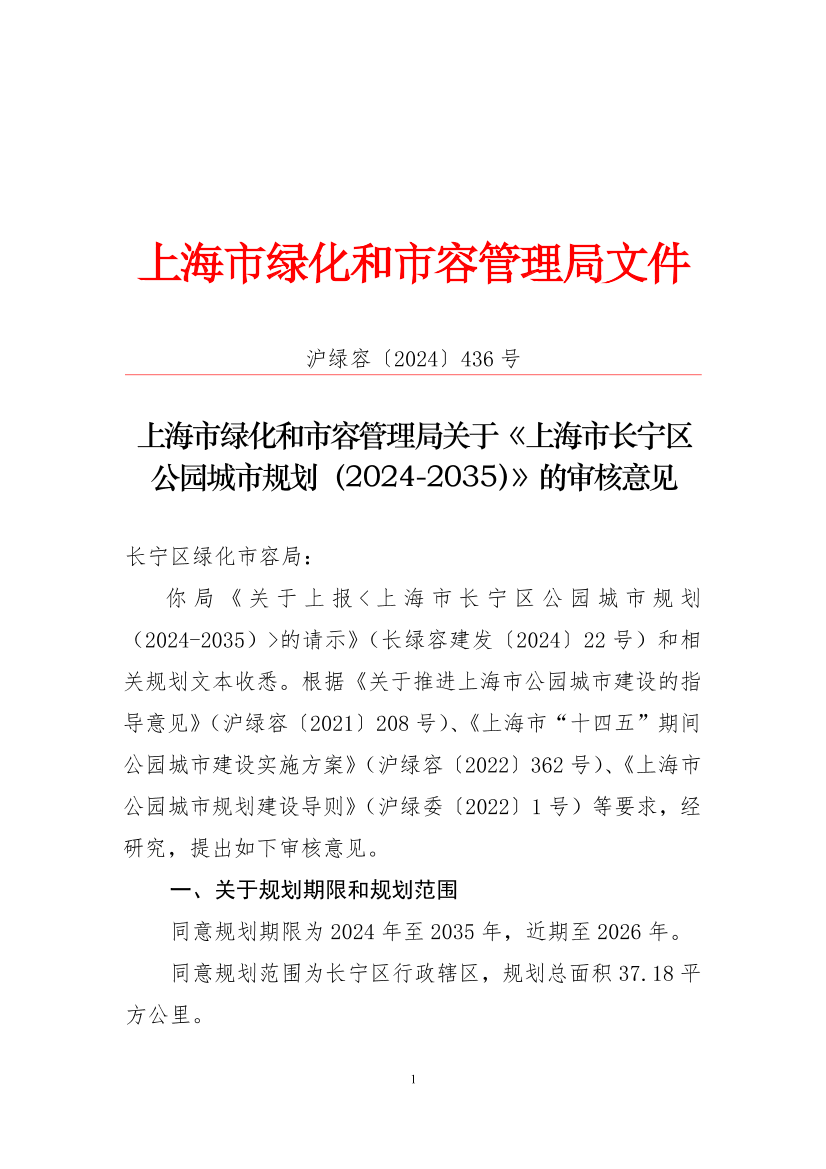 你局《关于上报<上海市长宁区公园城市规划(2024-2035)>的请示》(长绿容建发〔2024〕22号)和相关规划文本收悉。根据《关于推进上海市公园城市建设的指导意见》(沪绿容〔2021〕208号)、《上海市“十四五”期间公园城市建设实施方案》(沪绿容〔2022〕362号)、《上海市公园城市规划建设导则》(沪绿委〔2022〕1号)等要求,经研究,提出如下审核意见。