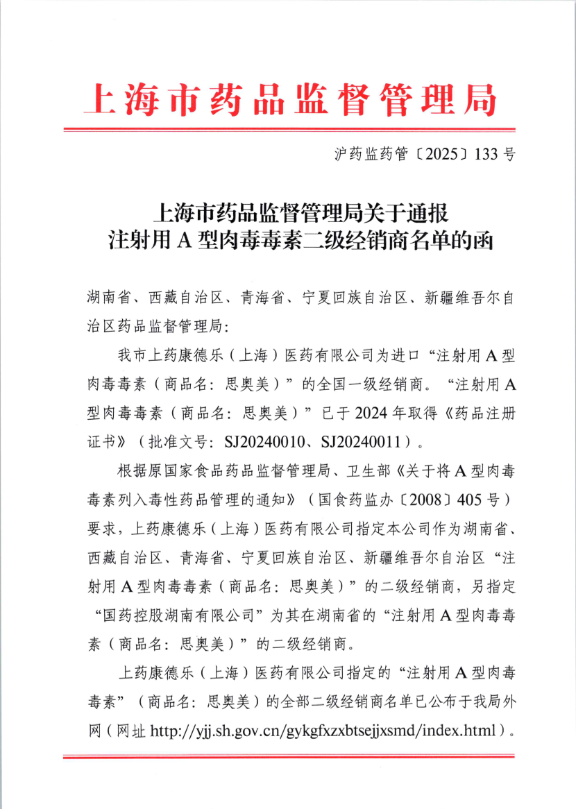 根据原国家食品药品监督管理局、卫生部《关于将A型肉毒毒素列入毒性药品管理的通知》(国食药监办〔2008〕405号)要求,上药康德乐(上海)医药有限公司指定本公司作为湖南省、西藏自治区、青海省、宁夏回族自治区、新疆维吾尔自治区“注射用A型肉毒毒素(商品名:思奥美)”的二级经销商,另指定“国药控股湖南有限公司”为其在湖南省的“注射用A型肉毒毒素(商品名:思奥美)”的二级经销商。
