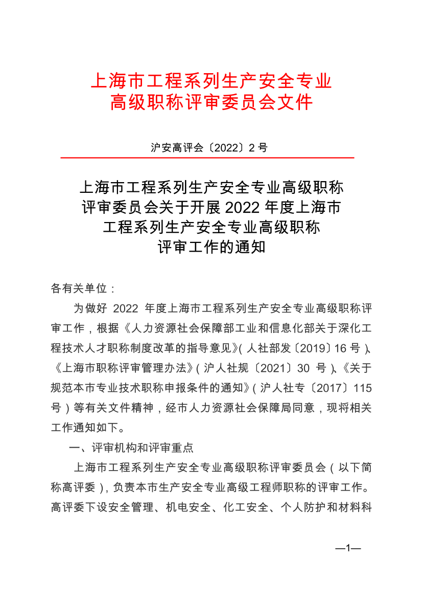 为做好2022年度上海市工程系列生产安全专业高级职称评审工作,根据《人力资源社会保障部工业和信息化部关于深化工程技术人才职称制度改革的指导意见》(人社部发〔2019〕16号)、《上海市职称评审管理办法》(沪人社规〔2021〕30号)、《关于规范本市专业技术职称申报条件的通知》(沪人社专〔2017〕115号)等有关文件精神,经市人力资源社会保障局同意,现将相关工作通知如下。