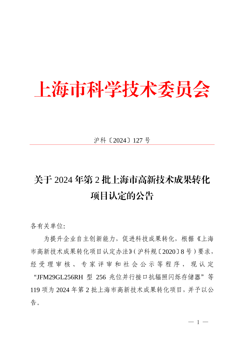 为提升企业自主创新能力,促进科技成果转化,根据《上海市高新技术成果转化项目认定办法》(沪科规〔2020〕8号)要求,经受理审核、专家评审和社会公示等程序,现认定“JFM29GL256RH型256兆位并行接口抗辐照闪烁存储器”等119项为2024年第2批上海市高新技术成果转化项目,并予以公告。