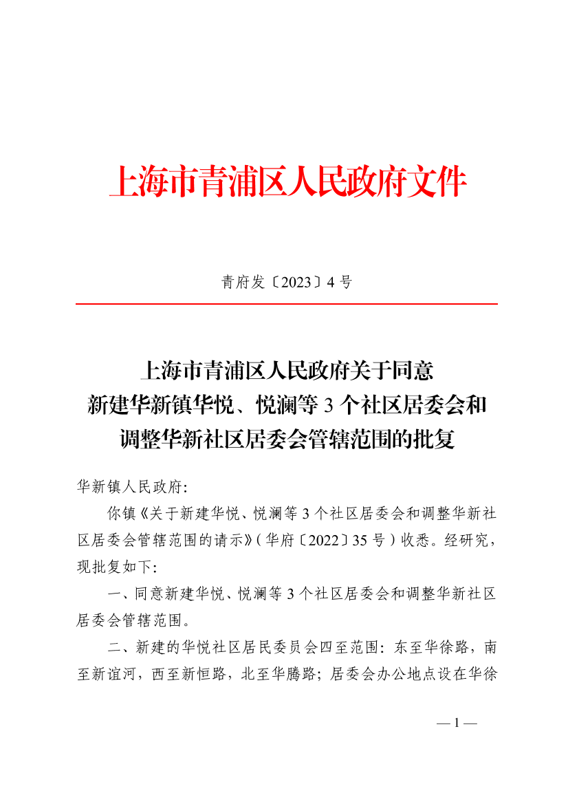 一、同意新建华悦、悦澜等3个社区居委会和调整华新社区居委会管辖范围。
