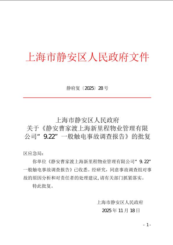 你单位《静安曹家渡上海新里程物业管理有限公司“9.22”一般触电事故调查报告》已收悉。经研究,同意事故调查组对事故的原因分析和对责任者的处理建议,请有关部门抓紧落实。