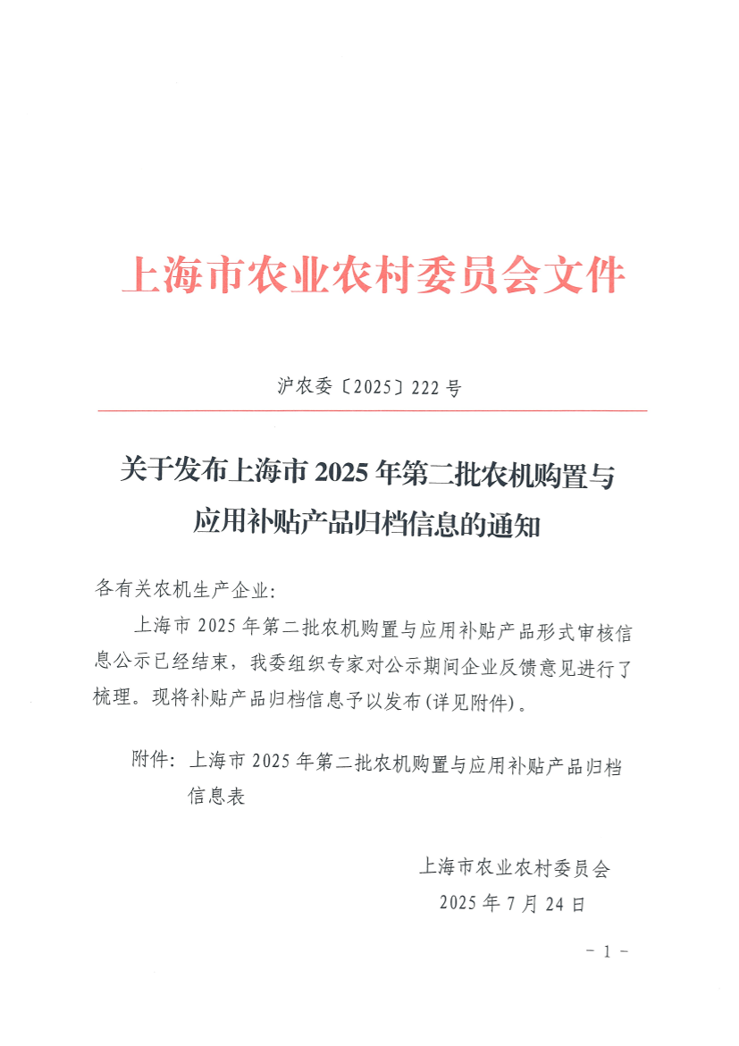 上海市2025年第二批农机购置与应用补贴产品形式审核信息公示已经结束,我委组织专家对公示期间企业反馈意见进行了梳理。现将补贴产品归档信息予以发布(详见附件)。