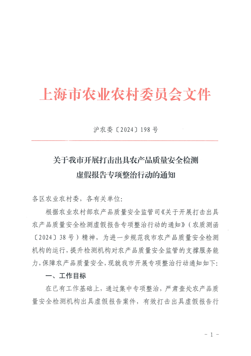 根据农业农村部农产品质量安全监管司《关于开展打击出具农产品质量安全检测虚假报告专项整治行动的通知》(农质测函〔2024〕38号)精神,为进一步规范我市农产品质量安全检测机构的运行,提升检测机构对农产品质量安全监管的支撑服务能力,保障农产品质量安全,现就我市开展专项整治行动通知如下: