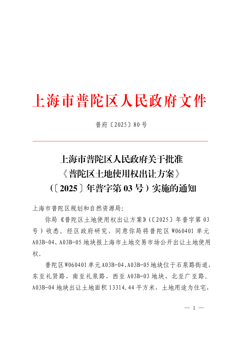 你局《普陀区土地使用权出让方案》(〔2025〕年普字第03号)收悉。经区政府研究,同意你局将普陀区W060401单元A03B-04、A03B-05地块报上海市土地交易市场公开出让土地使用权。