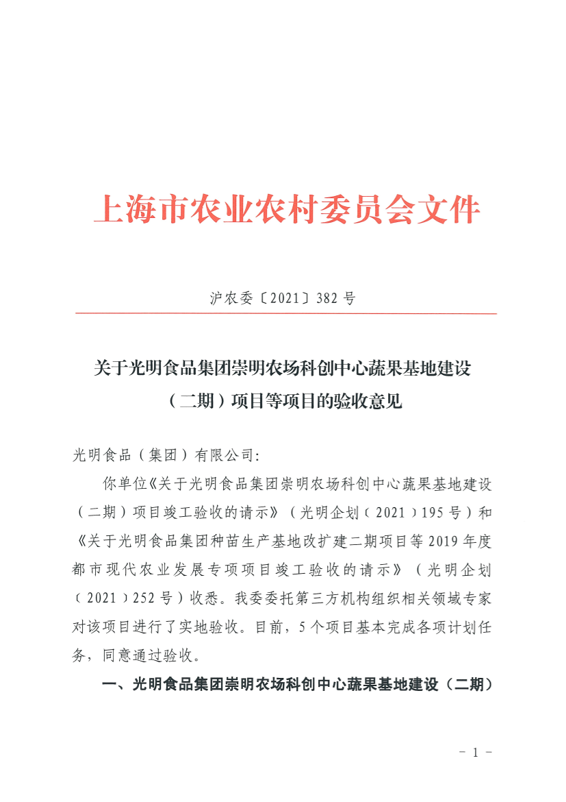 你单位《关于光明食品集团崇明农场科创中心蔬果基地建设(二期)项目竣工验收的请示》(光明企划﹝2021﹞195号)和《关于光明食品集团种苗生产基地改扩建二期项目等2019年度都市现代农业发展专项项目竣工验收的请示》(光明企划﹝2021﹞252号)收悉。我委委托第三方机构组织相关领域专家对该项目进行了实地验收。目前,5个项目基本完成各项计划任务,同意通过验收。