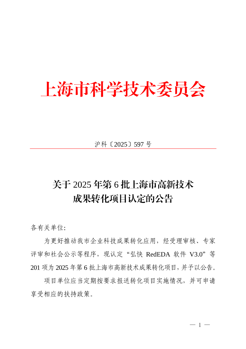 为更好推动我市企业科技成果转化应用,经受理审核、专家评审和社会公示等程序,现认定“弘快RedEDA软件V3.0”等201项为2025年第6批上海市高新技术成果转化项目,并予以公告。
