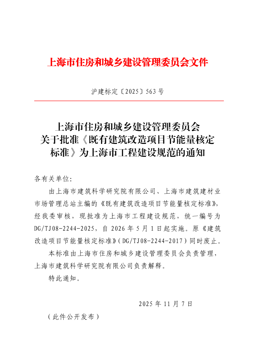 由上海市建筑科学研究院有限公司、上海市建筑建材业市场管理总站主编的《既有建筑改造项目节能量核定标准》,经我委审核,现批准为上海市工程建设规范,统一编号为DG/TJ08-2244-2025,自2026年5月1日起实施。原《建筑改造项目节能量核定标准》(DG/TJ08-2244-2017)同时废止。