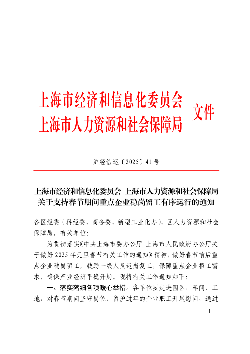 为贯彻落实《中共上海市委办公厅 上海市人民政府办公厅关于做好2025年元旦春节有关工作的通知》精神,做好春节前后重点企业稳岗留工,鼓励一线人员返岗复工,保障重点企业招工需求,确保产业经济平稳开局。现将有关工作通知如下: