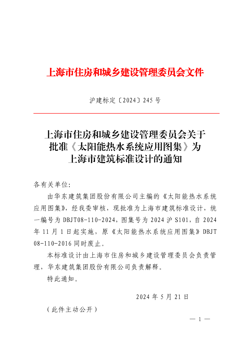 由华东建筑集团股份有限公司主编的《太阳能热水系统应用图集》,经我委审核,现批准为上海市建筑标准设计,统一编号为DBJT08-110-2024,图集号为2024沪S101,自2024年11月1日起实施,原《太阳能热水系统应用图集》DBJT 08-110-2016同时废止。