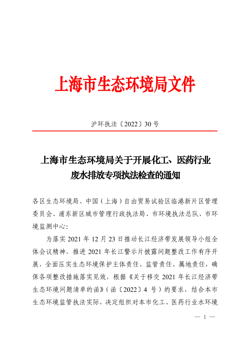 为落实2021年12月23日推动长江经济带发展领导小组全体会议精神,推进2021年长江警示片披露问题整改工作有序开展,全面压实生态环境保护主体责任、监管责任、属地责任,确保各项整改措施落实见效,根据《关于移交2021年长江经济带生态环境问题清单的函》(函〔2022〕4号)的要求,结合本市生态环境监管执法实际,决定组织对本市化工、医药行业水环境重点排污单位开展专项执法检查。现就有关工作通知如下。