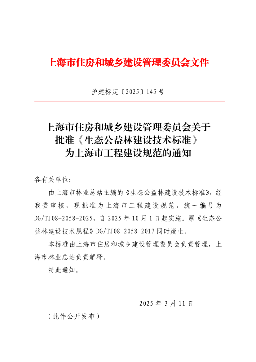由上海市林业总站主编的《生态公益林建设技术标准》,经我委审核,现批准为上海市工程建设规范,统一编号为DG/TJ08-2058-2025,自2025年10月1日起实施。原《生态公益林建设技术规程》DG/TJ08-2058-2017同时废止。
