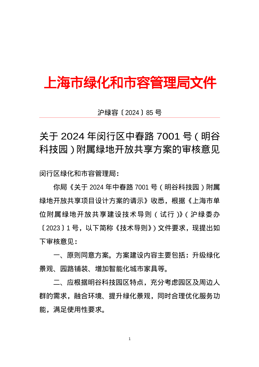 你局《关于2024年中春路7001号(明谷科技园)附属绿地开放共享项目设计方案的请示》收悉,根据《上海市单位附属绿地开放共享建设技术导则(试行)》(沪绿委办
