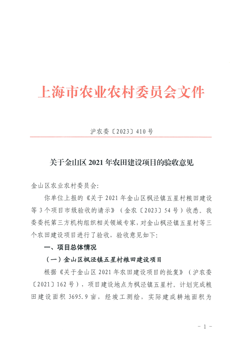 你单位上报的《关于2021年金山区枫泾镇五星村粮田建设等3个项目市级验收的请示》(金农〔2023〕54号)收悉。我委委托第三方机构组织相关领域专家,对金山枫泾镇五星村等三个农田建设项目进行了验收,验收意见如下: