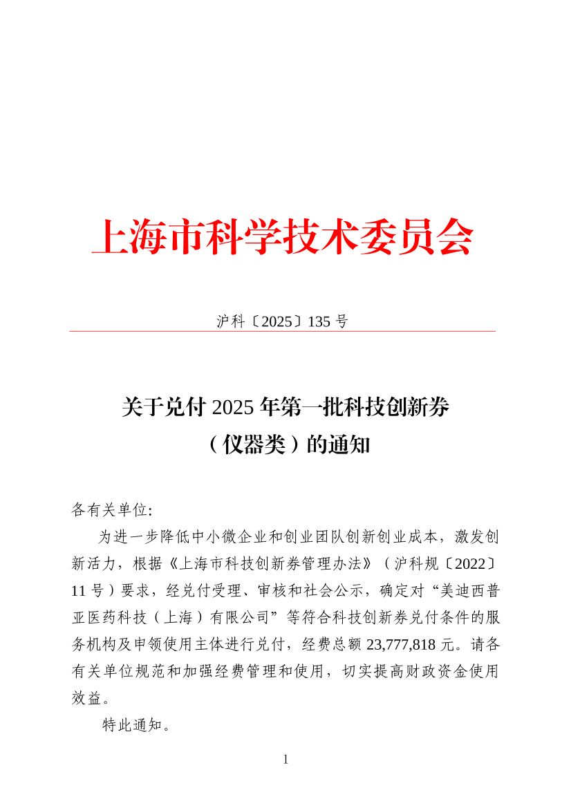 为进一步降低中小微企业和创业团队创新创业成本,激发创新活力,根据《上海市科技创新券管理办法》(沪科规〔2022〕11号)要求,经兑付受理、审核和社会公示,确定对“美迪西普亚医药科技(上海)有限公司”等符合科技创新券兑付条件的服务机构及申领使用主体进行兑付,经费总额23,777,818元。请各有关单位规范和加强经费管理和使用,切实提高财政资金使用效益。