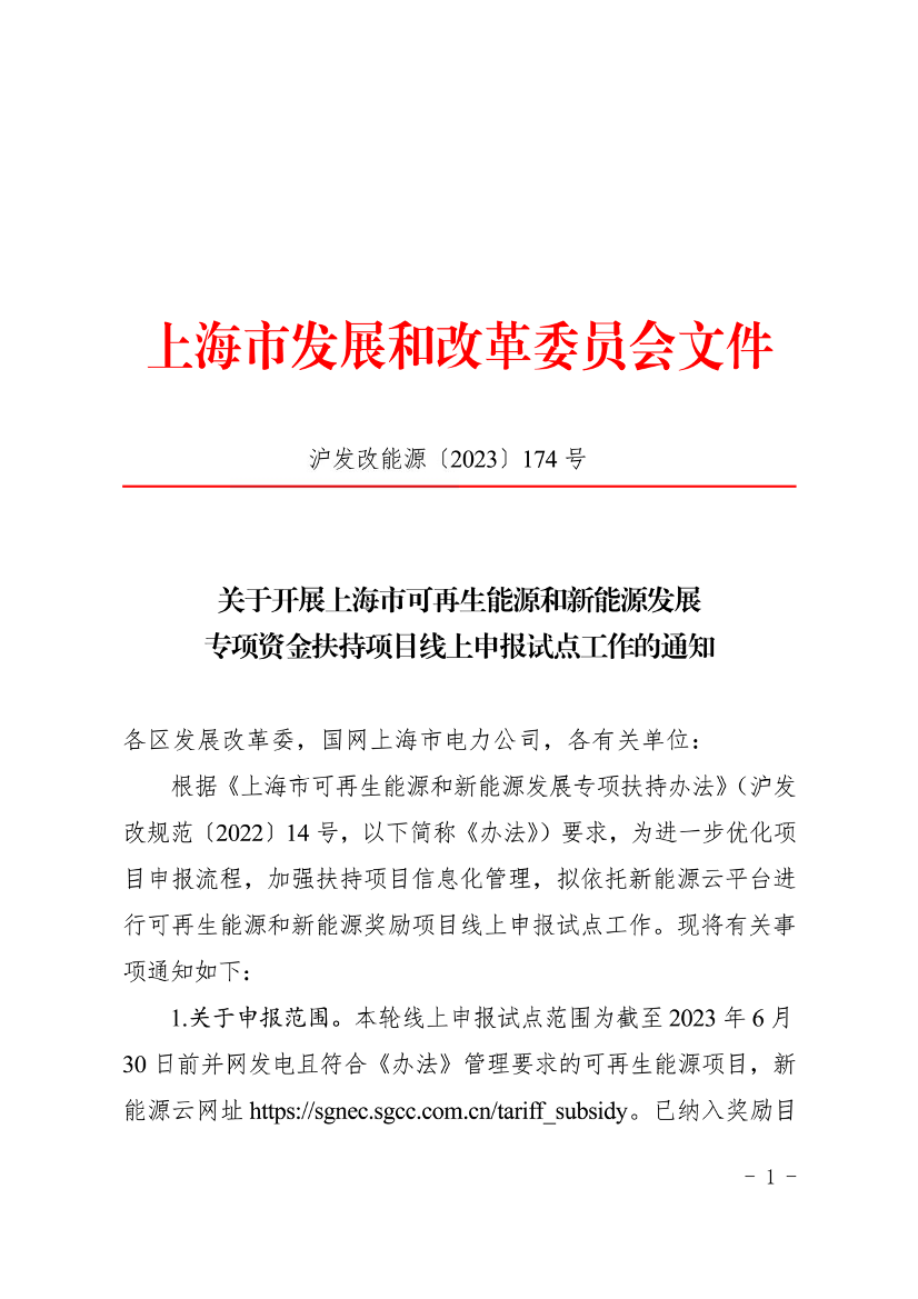 根据《上海市可再生能源和新能源发展专项扶持办法》(沪发改规范〔2022〕14号,以下简称《办法》)要求,为进一步优化项目申报流程,加强扶持项目信息化管理,拟依托新能源云平台进行可再生能源和新能源奖励项目线上申报试点工作。现将有关事项通知如下: