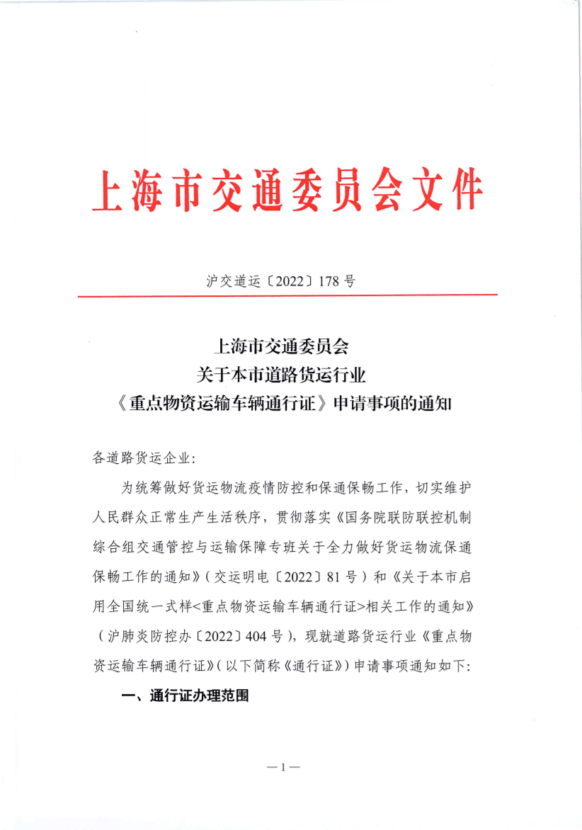 为统筹做好货运物流疫情防控和保通保畅工作,切实维护人民群众正常生产生活秩序,贯彻落实《国务院联防联控机制综合组交通管控与运输保障专班关于全力做好货运物流保通保畅工作的通知》(交运明电〔2022〕81号)和《关于本市启用全国统一式样<重点物资运输车辆通行证>相关工作的通知》(沪肺炎防控办〔2022〕404号),现就道路货运行业《重点物资运输车辆通行证》(以下简称《通行证》)申请事项通知如下: