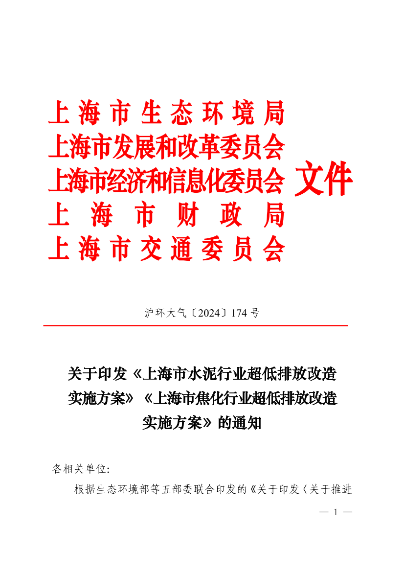 根据生态环境部等五部委联合印发的《关于印发〈关于推进实施水泥行业超低排放的意见〉〈关于推进实施焦化行业超低排放的意见〉的通知》(环大气〔2024〕5号)要求,本市有关部门和单位研究制定了《上海市水泥行业超低排放改造实施方案》《上海市焦化行业超低排放改造实施方案》,现印发给你们,请遵照执行。