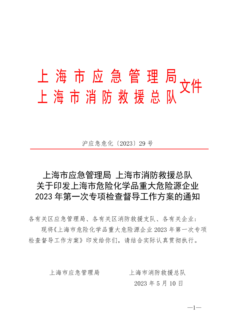 为深入贯彻党的二十大和习近平总书记关于安全生产的重要指示批示精神,深刻吸取近期国内外危险化学品重特大事故教训,进一步落实国务院安委会安全生产工作“十五条硬措施”和《全国重大事故隐患专项排查整治2023行动总体方案》工作部署以及“上海安全生产78条”创新举措,精准防控危险化学品重大危险源安全风险、坚决遏制重特大事故,根据《应急管理部办公厅关于开展危险化学品重大危险源企业2023年第一次安全专项检查督导工作的通知》(应急厅函〔2023〕105号)和《上海市应急管理局关于组织开展危险化学品企业装置设备带“病”运行安全等10个专项整治的通知》(沪应急危化〔2023〕22号)等要求,从即日起开展上海市危险化学品重大危险源企业2023年第一次安全专项检查督导工作,现制定总体方案如下。