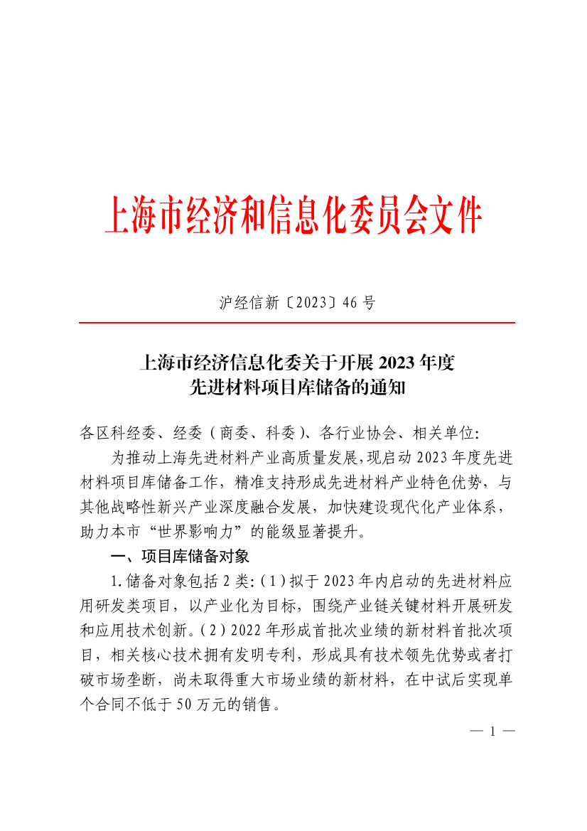 1.储备对象包括2类:(1)拟于2023年内启动的先进材料应用研发类项目,以产业化为目标,围绕产业链关键材料开展研发和应用技术创新。(2)2022年形成首批次业绩的新材料首批次项目,相关核心技术拥有发明专利,形成具有技术领先优势或者打破市场垄断,尚未取得重大市场业绩的新材料,在中试后实现单个合同不低于50万元的销售。
