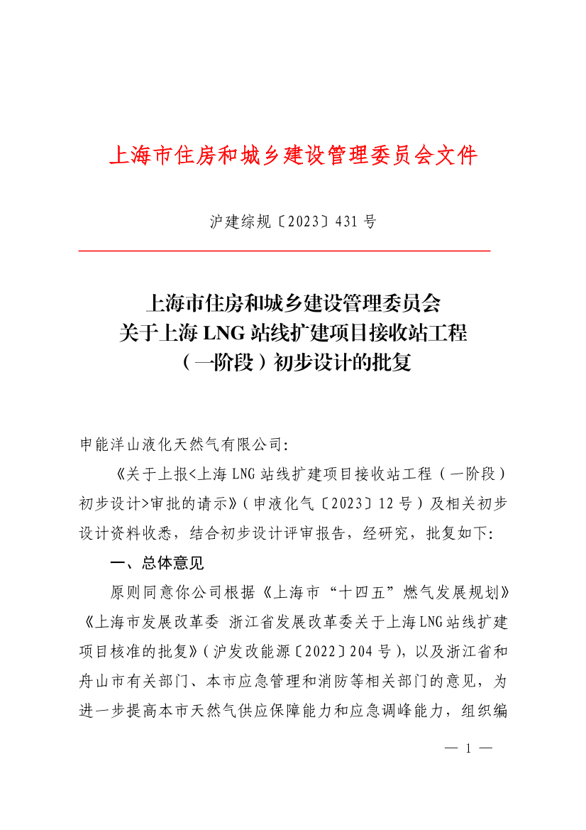 《关于上报<上海LNG站线扩建项目接收站工程(一阶段)初步设计>审批的请示》(申液化气〔2023〕12号)及相关初步设计资料收悉,结合初步设计评审报告,经研究,批复如下: