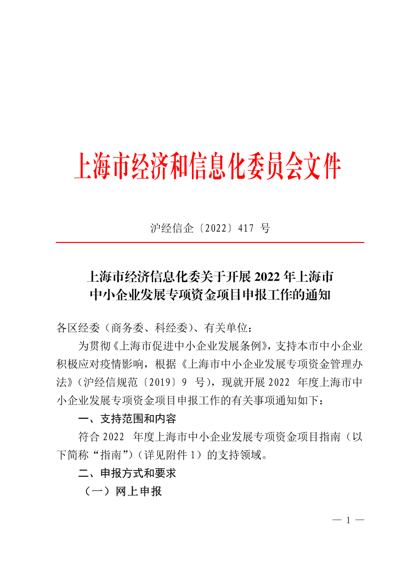 为贯彻《上海市促进中小企业发展条例》,支持本市中小企业积极应对疫情影响,根据《上海市中小企业发展专项资金管理办法》(沪经信规范〔2019〕9号),现就开展2022年度上海市中小企业发展专项资金项目申报工作的有关事项通知如下: