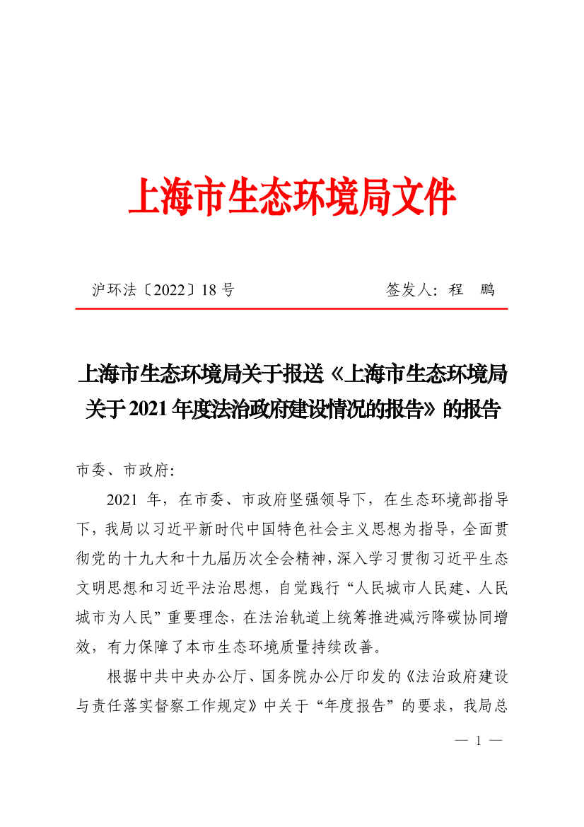 现将《上海市生态环境局关于2021年度法治政府建设情况的报告》报上。报告内容将通过我局门户网站向社会主动公开,接受社会监督。