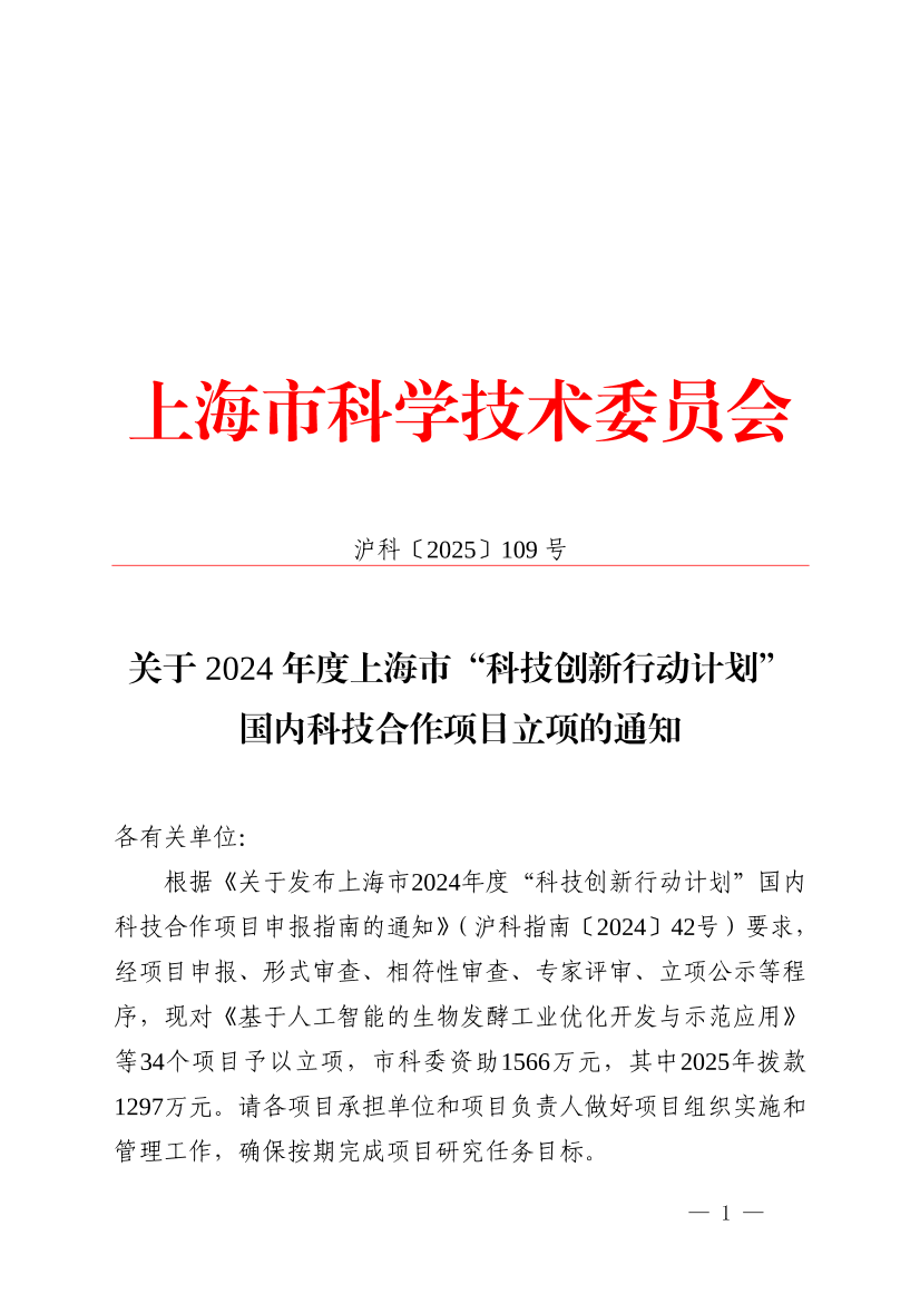根据《关于发布上海市2024年度“科技创新行动计划”国内科技合作项目申报指南的通知》(沪科指南〔2024〕42号)要求,经项目申报、形式审查、相符性审查、专家评审、立项公示等程序,现对《基于人工智能的生物发酵工业优化开发与示范应用》等34个项目予以立项,市科委资助1566万元,其中2025年拨款1297万元。请各项目承担单位和项目负责人做好项目组织实施和管理工作,确保按期完成项目研究任务目标。