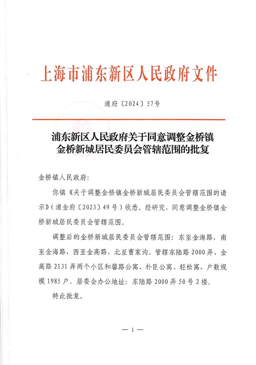 你镇《关于调整金桥镇金桥新城居民委员会管辖范围的请示》(浦金府〔2023〕49号)收悉。经研究,同意调整金桥镇金桥新城居民委员会管辖范围。