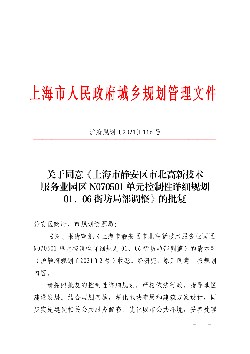 《关于报请审批〈上海市静安区市北高新技术服务业园区N070501单元控制性详细规划01、06街坊局部调整〉的请示》(沪静府规划〔2021〕2号)收悉。经研究,原则同意上报规划内容。