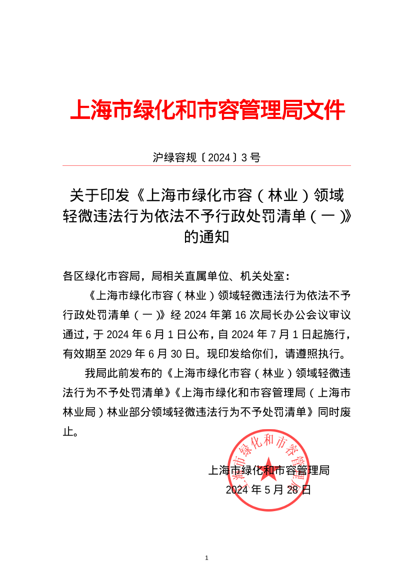 《上海市绿化市容(林业)领域轻微违法行为依法不予行政处罚清单(一)》经 2024年第 16次局长办公会议审议通过,于 2024年 6月 1 日公布,自 2024年 7月 1 日起施行,有效期至 2029年 6月 30 日。现印发给你们,请遵照执行。