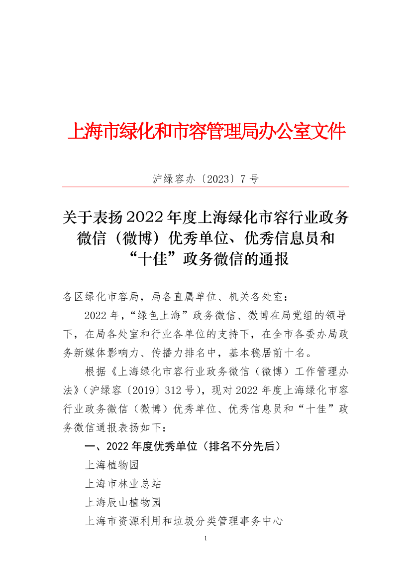 根据《上海绿化市容行业政务微信(微博)工作管理办法》(沪绿容〔2019〕312号),现对2022年度上海绿化市容行业政务微信(微博)优秀单位、优秀信息员和“十佳”政务微信通报表扬如下: