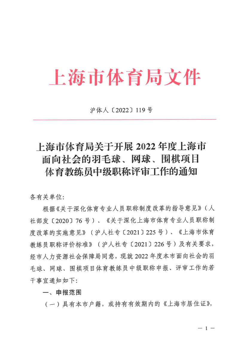 根据《关于深化体育专业人员职称制度改革的指导意见》(人社部发〔2020〕76号)、《关于深化上海市体育专业人员职称制度改革的实施意见》(沪人社专〔2021〕225号)、《上海市体育教练员职称评价标准》(沪人社专〔2021〕226号)及有关要求,经市人力资源社会保障局同意,现就2022年度本市面向社会的羽毛球、网球、围棋项目体育教练员中级职称申报、评审工作的若干事宜通知如下: