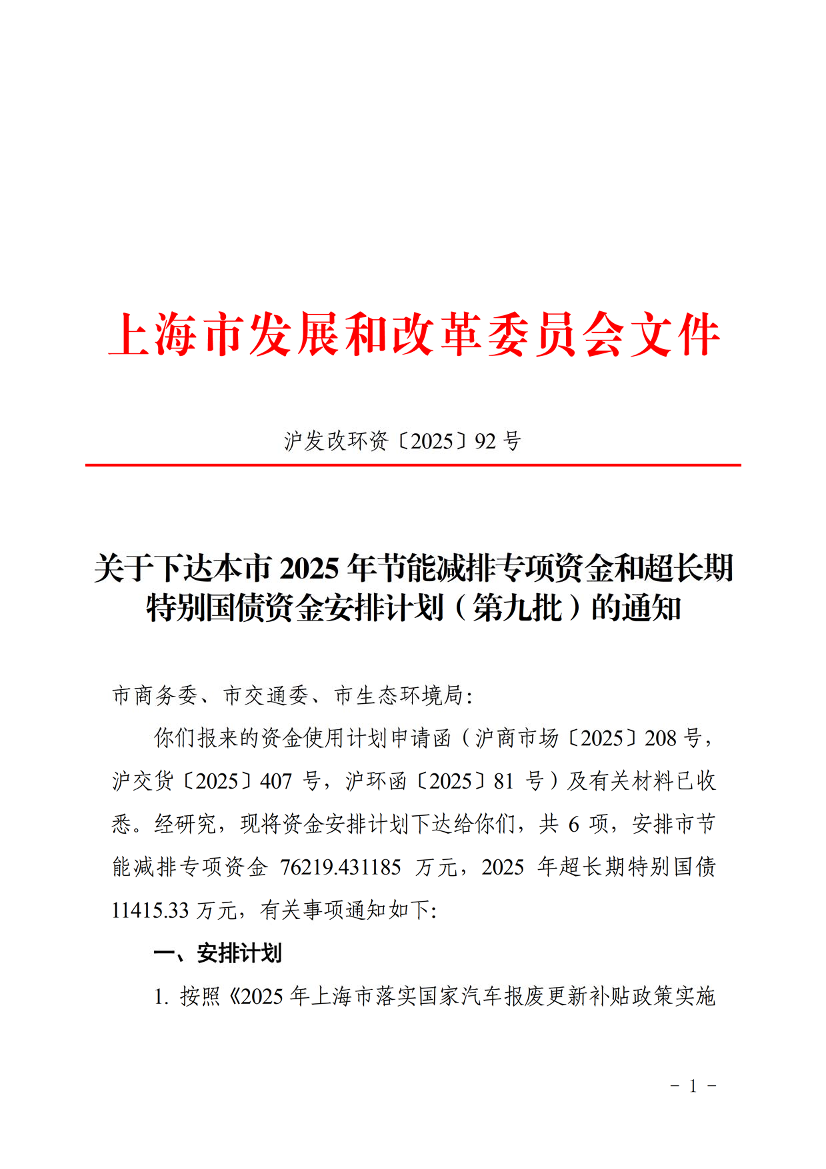 1. 按照《2025年上海市落实国家汽车报废更新补贴政策实施细则》(沪商市场〔2025〕20号)规定,安排经审核通过的2025年第五批1796人次国家汽车报废更新补贴资金,由市节能减排专项资金安排472.275万元、2025年超长期特别国债安排2676.225万元,合计3148.5万元。