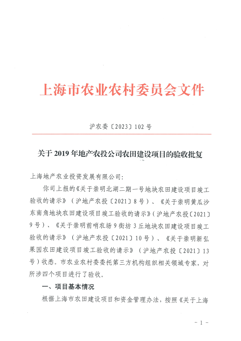 你司上报的《关于崇明北湖二期一号地块农田建设项目竣工验收的请示》(沪地产农投〔2021〕8号)、《关于崇明黄瓜沙东南角地块农田建设项目竣工验收的请示》(沪地产农投〔2021〕9号)、《关于崇明前哨农场9街坊3丘地块农田建设项目竣工验收的请示》(沪地产农投〔2021〕10号)、《关于崇明新弘果园农田建设项目竣工验收的请示》(沪地产农投〔2021〕13号)收悉。市农业农村委委托第三方机构组织相关领域专家,对所涉四个项目进行了验收。