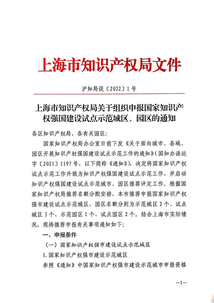 国家知识产权局办公室日前下发《关于面向城市、县域、园区开展知识产权强国建设试点示范工作的通知》(国知办函运字〔2021〕1197号,以下简称《通知》),决定将国家知识产权试点示范工作升级为知识产权强国建设试点示范工作,并启动知识产权强国建设试点示范城市、园区推荐评定工作。根据国家知识产权局推荐名额分配安排,本市推荐申报国家知识产权强市建设试点示范城区、园区名额分别为示范城区2个、试点城区3个、示范园区1个、试点园区2个。结合上海市实际情况,现将推荐申报有关事项通知如下: