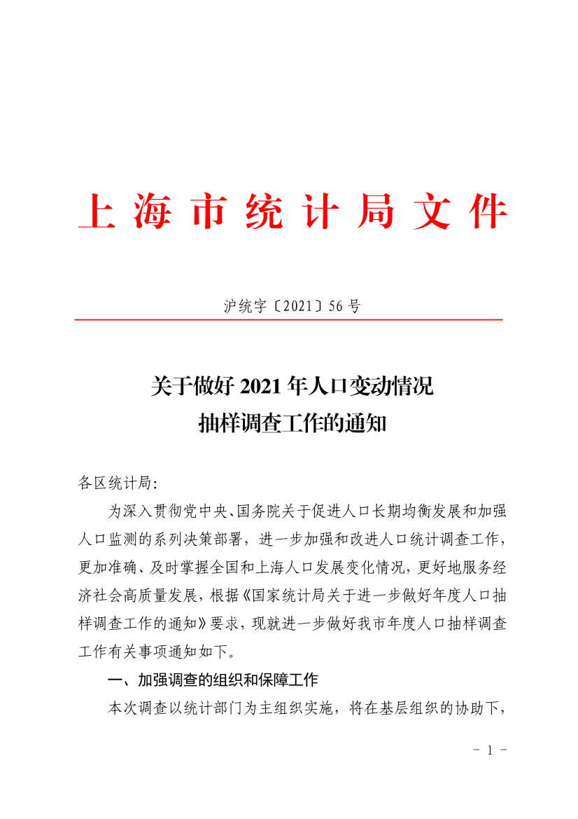为深入贯彻党中央、国务院关于促进人口长期均衡发展和加强人口监测的系列决策部署,进一步加强和改进人口统计调查工作,更加准确、及时掌握全国和上海人口发展变化情况,更好地服务经济社会高质量发展,根据《国家统计局关于进一步做好年度人口抽样调查工作的通知》要求,现就进一步做好我市年度人口抽样调查工作有关事项通知如下。