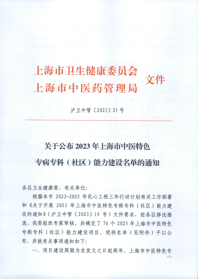 根据本市2023-2025年民心工程三年行动计划有关工作部署和《关于开展2023年上海市中医特色专病专科(社区)能力建设的通知》(沪卫中管〔2023〕19号)文件要求,经各区择优推选、我委组织专家审核,共确定了76个2023年上海市中医特色专病专科(社区)能力建设项目。现将名单(见附件)予以公布,并就有关事项通知如下: