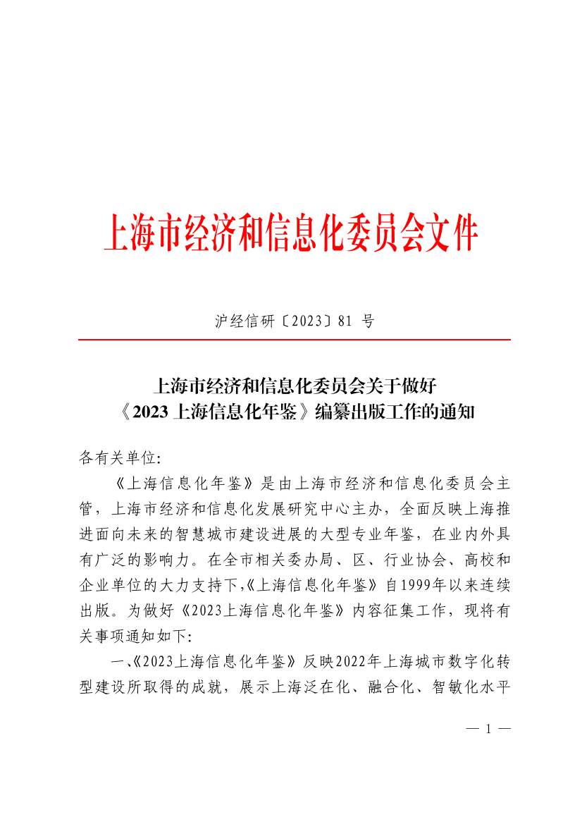 一、《2023上海信息化年鉴》反映2022年上海城市数字化转型建设所取得的成就,展示上海泛在化、融合化、智敏化水平的提升。请各相关单位按照编辑部提供的撰稿大纲,认真做好相关材料的收集整理及编撰工作。《2023上海信息化年鉴》公开出版发行,请各供稿单位做好稿件脱密审查工作。
