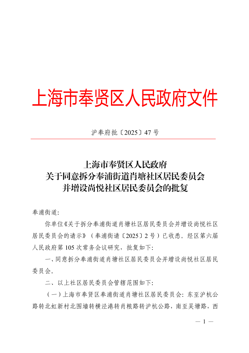 一、同意拆分奉浦街道肖塘社区居民委员会并增设尚悦社区居民委员会。