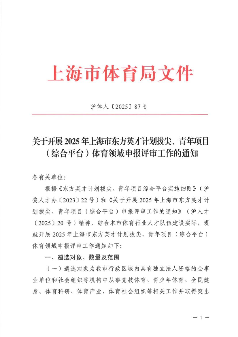 根据《东方英才计划拔尖、青年项目综合平台实施细则》(沪委人才办〔2023〕22号)和《关于开展2025年上海市东方英才计划拔尖、青年项目(综合平台)申报评审工作的通知》(沪人才〔2025〕20号)精神,结合本市体育行业人才队伍建设实际,现就开展2025年上海市东方英才计划拔尖、青年项目(综合平台)体育领域申报评审工作通知如下: