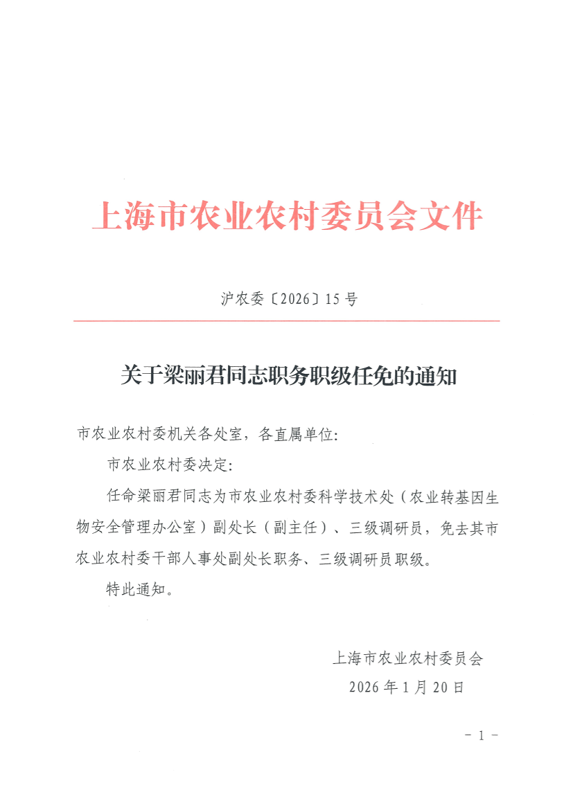 任命梁丽君同志为市农业农村委科学技术处(农业转基因生物安全管理办公室)副处长(副主任)、三级调研员,免去其市农业农村委干部人事处副处长职务、三级调研员职级。