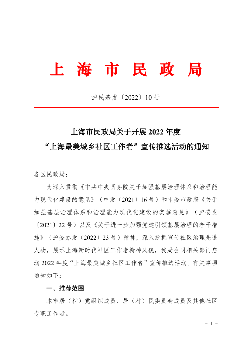 为深入贯彻《中共中央国务院关于加强基层治理体系和治理能力现代化建设的意见》(中发〔2021〕16号)和市委市政府《关于加强基层治理体系和治理能力现代化建设的实施意见》(沪委发〔2021〕22号)以及《关于进一步加强党建引领基层治理的若干措施》(沪委办发〔2022〕23号)精神,深入挖掘宣传社区治理先进人物,展示上海新时代社区工作者精神风貌,我局会同相关部门启动2022年度“上海最美城乡社区工作者”宣传推选活动。有关事项通知如下: