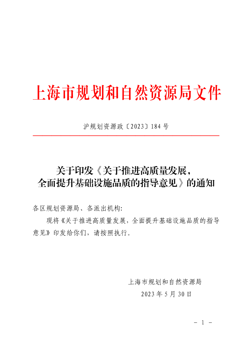现将《关于推进高质量发展,全面提升基础设施品质的指导意见》印发给你们,请按照执行。