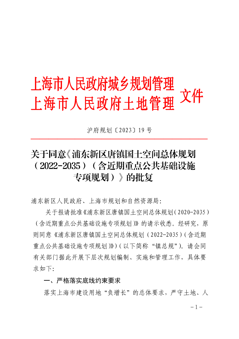 关于报请批准《浦东新区唐镇国土空间总体规划(2020-2035)(含近期重点公共基础设施专项规划)》的请示收悉。经研究,原则同意《浦东新区唐镇国土空间总体规划(2022-2035)(含近期重点公共基础设施专项规划)》)(以下简称“镇总规”)。请会同有关部门据此开展下层次规划编制、实施和管理工作,具体要求如下: