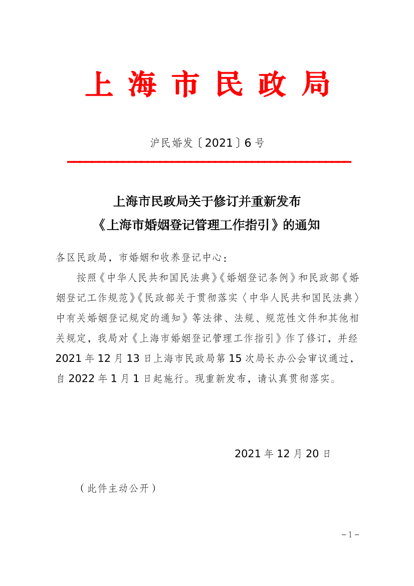 按照《中华人民共和国民法典》《婚姻登记条例》和民政部《婚姻登记工作规范》《民政部关于贯彻落实〈中华人民共和国民法典〉中有关婚姻登记规定的通知》等法律、法规、规范性文件和其他相关规定,我局对《上海市婚姻登记管理工作指引》作了修订,并经2021年12月13日上海市民政局第15次局长办公会审议通过,自2022年1月1日起施行。现重新发布,请认真贯彻落实。