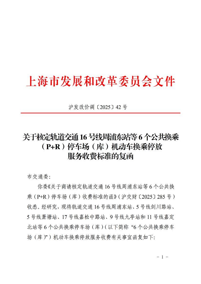 你委《关于商请核定轨道交通16号线周浦东站等6个公共换乘(P+R)停车场(库)收费标准的函》(沪交财〔2025〕285号)收悉。经研究,现将轨道交通16号线周浦东站、5号线剑川路站、5号线萧塘站、17号线嘉松中路站、9号线九亭站和11号线嘉定北站等6个公共换乘停车场(库)(以下简称“6个公共换乘停车场(库)”)机动车换乘停放服务收费有关事宜函复如下: