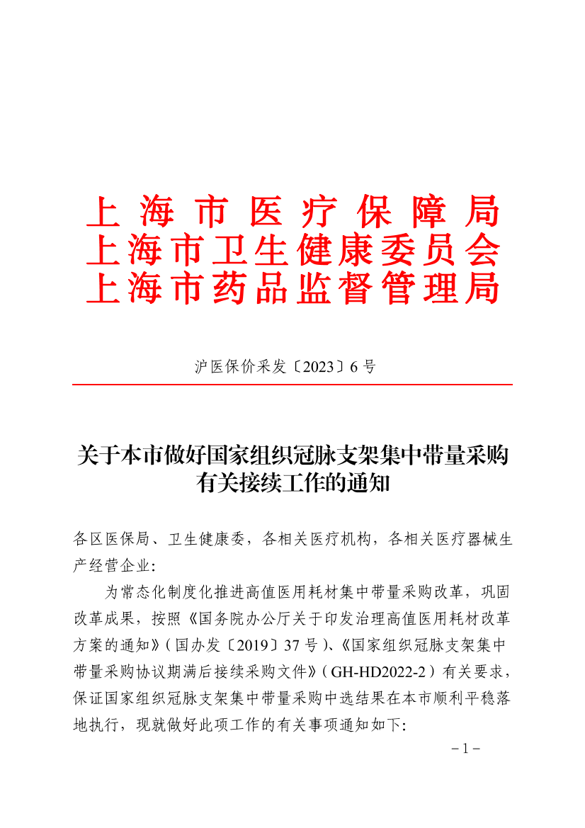 为常态化制度化推进高值医用耗材集中带量采购改革,巩固改革成果,按照《国务院办公厅关于印发治理高值医用耗材改革方案的通知》(国办发〔2019〕37号)、《国家组织冠脉支架集中带量采购协议期满后接续采购文件》(GH-HD2022-2)有关要求,保证国家组织冠脉支架集中带量采购中选结果在本市顺利平稳落地执行,现就做好此项工作的有关事项通知如下: