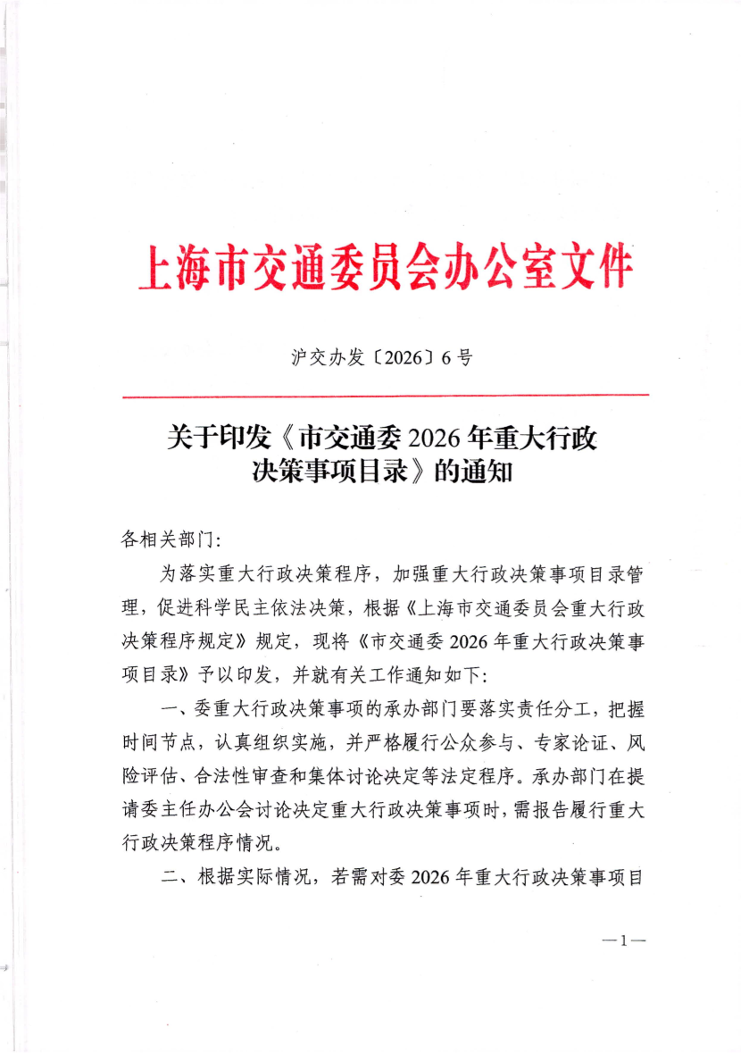 为落实重大行政决策程序,加强重大行政决策事项目录管理,促进科学民主依法决策,根据《上海市交通委员会重大行政决策程序规定》规定,现将《市交通委2026年重大行政决策事项目录》予以印发,并就有关工作通知如下:
